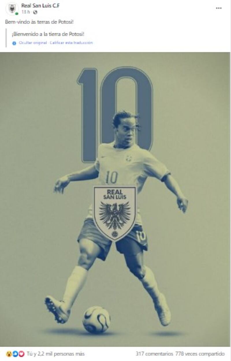 El Real San Luis le dio la bienvenida a Ronaldinho a las tierras potosinas, mientras que anunciaron que darán más detalles sobre su llegada esta noche a las 20:00 hrs.