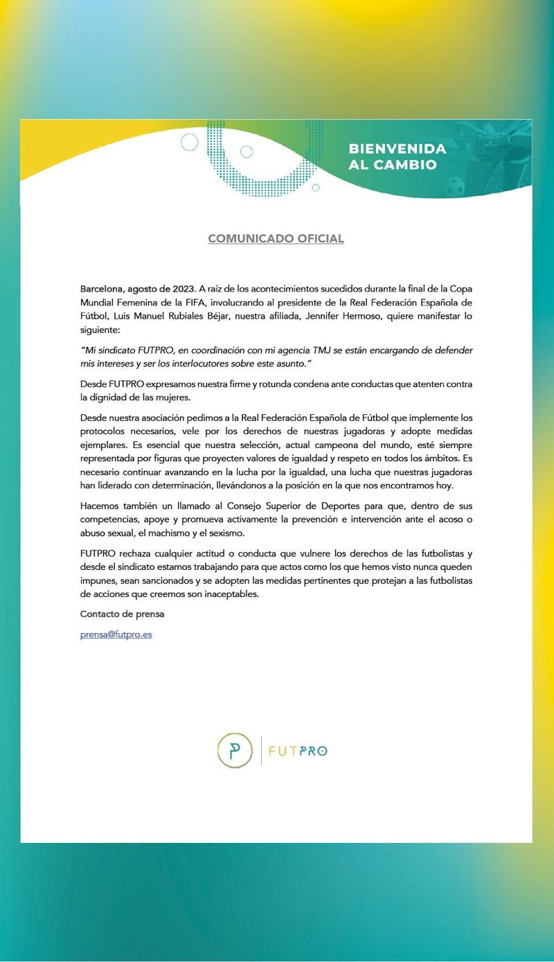 “Desde nuestros asociación pedimos a la Real Federación Española de Fútbol que implemente los protocolos necesarios, vele por los derechos de nuestras jugadoras y adopte medidas ejemplares [...]. Es necesario continuar avanzando en la lucha por la igualdad, una lucha que nuestras jugadoras han liderado con determinación, llevándonos a la posición en la que nos encontramos hoy”, se lee a través de un comunicado emitido por el sindicato Futpro en coordinación con la agencia TMJ, encargados de defender los intereses de Hermoso.