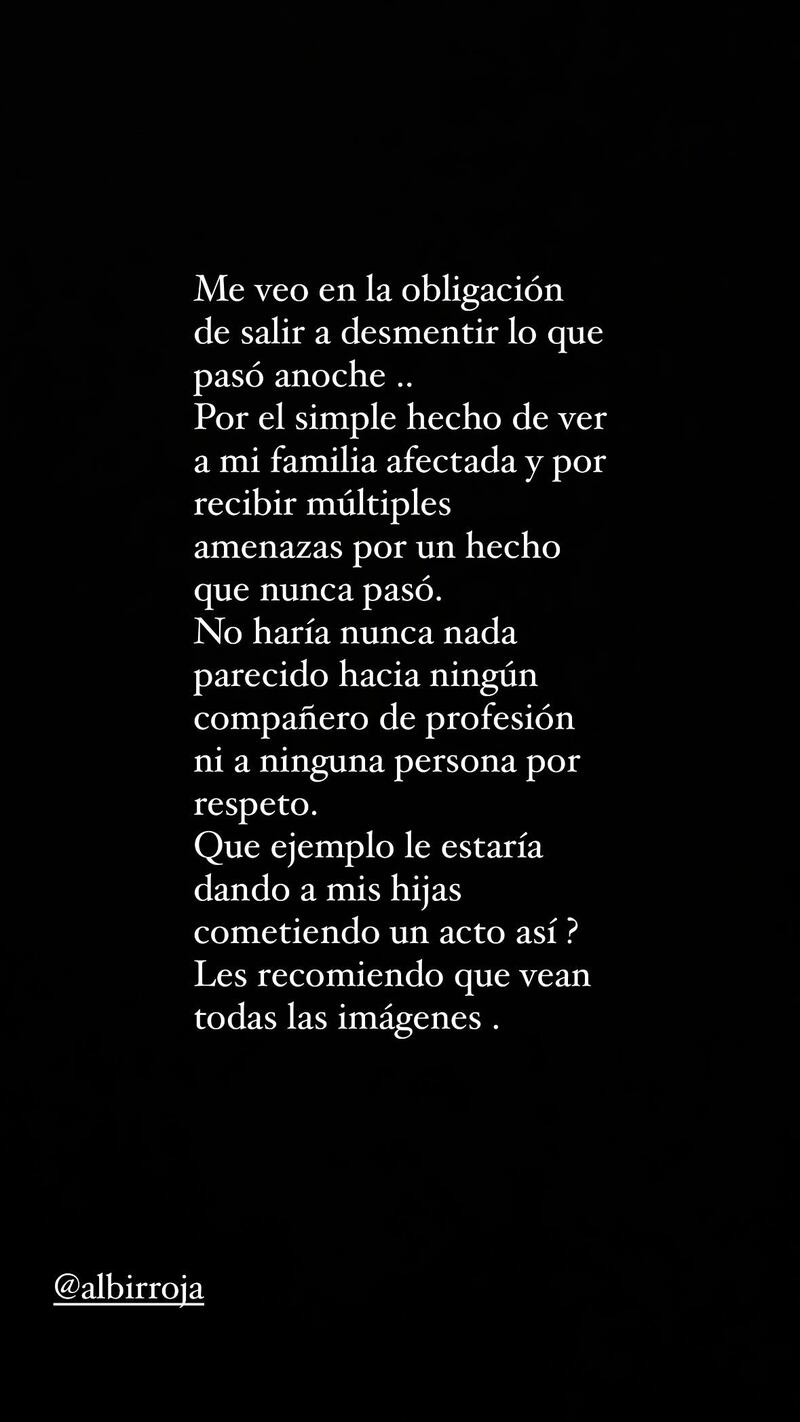 “Me veo en la obligación de salir a desmentir lo que pasó anoche… por el simple hecho de ver a mi familia afectada y por recibir múltiples amenazas por un hecho que nunca pasó. No haría nuca nada parecido hacia algún compañero ni a ninguna persona, por respeto. ¿Qué ejemplo le estaría dando a mis hijas? Les recomiendo que vean todas las imágenes”, se lee.