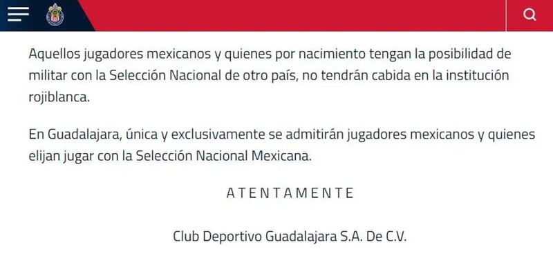 “En Chivas pueden jugar elementos que sean mexicanos por nacimiento sin importar que elijan representar a otra selección que no sea la mexicana”, asterisco que también le abrió la puerta a Santiago Ormeño, quien ya jugó con el combinado de Perú.