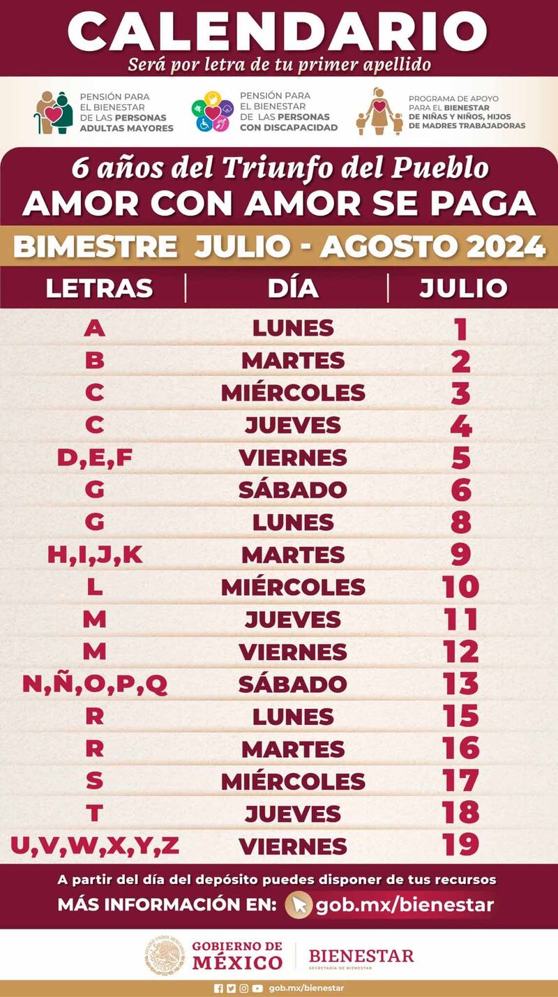 La información oficial compartida por Ariadna Montiel Reyes, titular de la Secretaría del Bienestar, demuestra que en los primeros 20 días de julio, todos los beneficiarios de la Pensión Bienestar 2024 ya habrán cobrado el bimestre de Julio-Agosto, quedando oficialmente con los siguientes días de pago por letra de apellido: