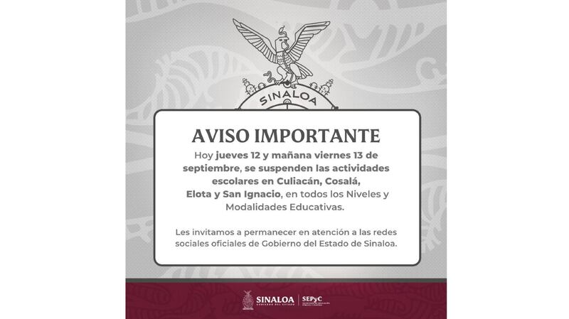 “Hoy jueves 12 y mañana viernes 13 de septiembre, se suspenden las actividades escolares en Culiacán, Cosalá, Elota y San Ignacio, en todos los niveles y modalidades educativas”, se lee a través de un comunicado oficial por parte de la SEP de Sinaloa.