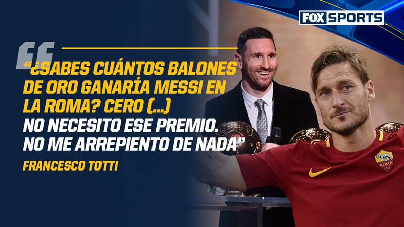 En una entrevista con el podcast Viva el Futbol, Totti expresó: “Pon a Messi durante 25 años en la Roma; 25 años y dime cuántos Balones de Oro ganaría. ¿Ganaría diez Balones de Oro? ¿Sabes cuántos ganaría? Cero“.