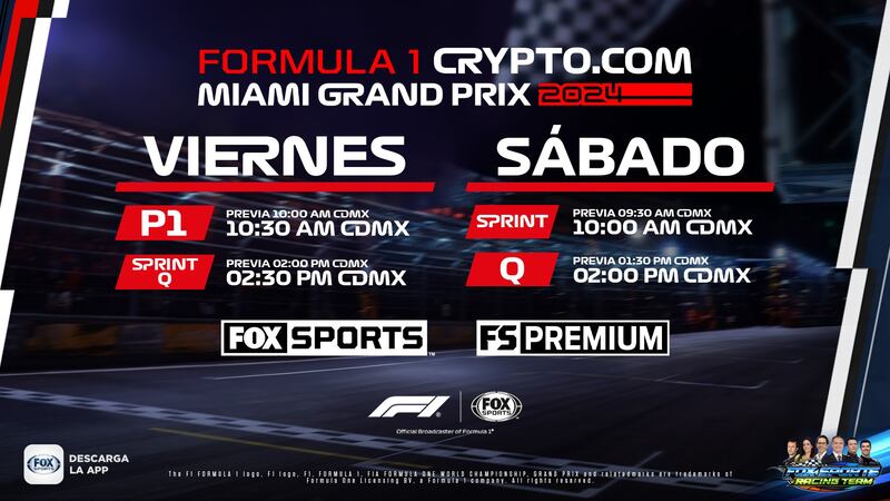 La transmisión de la carrera del Gran Premio de Miami 2024 de Fórmula 1 la podrás disfrutar en vivo por televisión a través de FOX Sports y FOX Sports Premium, mientras que online estará disponible mediante la app de FOX Sports, Amazon Prime Video y Claro Video.