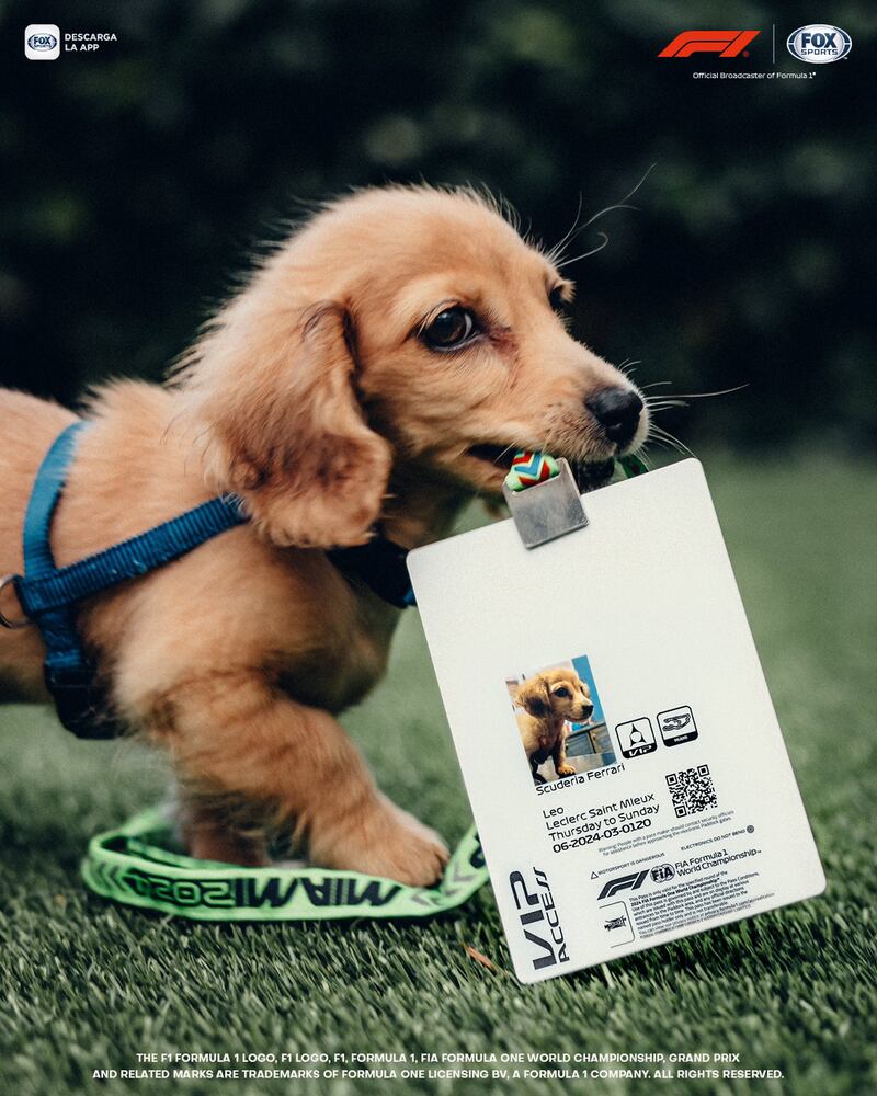 Las postales del cachorro rápidamente se viralizaron en las redes sociales, donde se mostró al animalito posando con su gafete de F1 personalizado: Foto, nombre completo y QR, como debe ser.