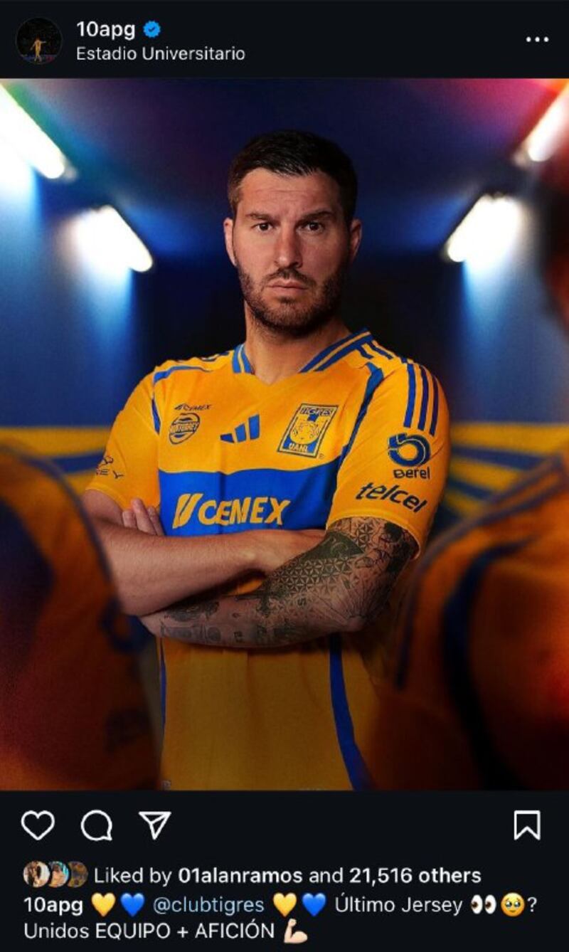 André Pierre Gignac dejó preocupación para los aficionados de Tigres, quienes inundaron su publicación en Instagram con diversos mensajes, después de compartir la nueva playera del equipo con el mensaje “¿Último jersey? Unidos EQUIPO + AFICIÓN”.