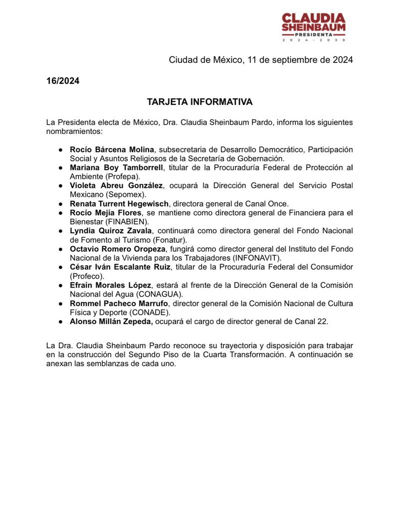 ¿CUÁLES FUERON LOS OTROS NOMBRAMIENTOS DE CLAUDIA SHEINBAUM?