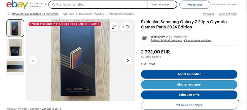 Desde el mes posterior a la clausura de los Juegos Olímpicos de París 2024, el celular edición limitada de Samsung modelo Galaxy Z Flip6, ya estaba a la venta por parte de varios atletas que acudieron a la justa, quienes lo pusieron en páginas como eBay, con un costo de hasta 2,300 euros; es decir, poco menos de 50 mil pesos.