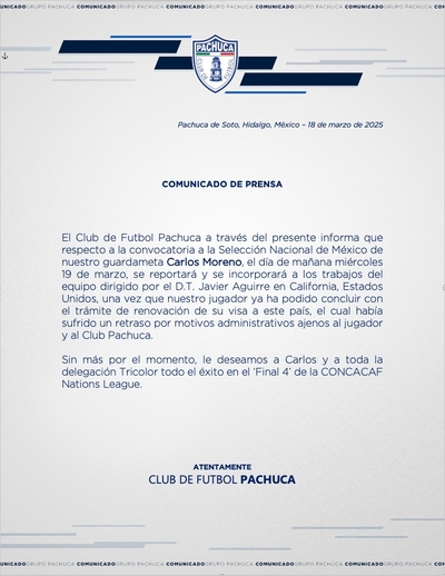 “El Club de Futbol Pachuca a través del presente informa respecto a la convocatoria a la Selección Nacional de México de nuestro guardameta Carlos Moreno, el día de mañana miércoles 19 de marzo, se reportará y se incorporará a los trabajos del equipo dirigido por el DT, Javier Aguirre, en California, Estados Unidos, una vez que nuestro jugador ya ha podio concluir con el trámite de renovación de su visa a este país, el cual había sufrido un retraso por motivos administrativos ajenos al jugador al Cub Pachuca”.