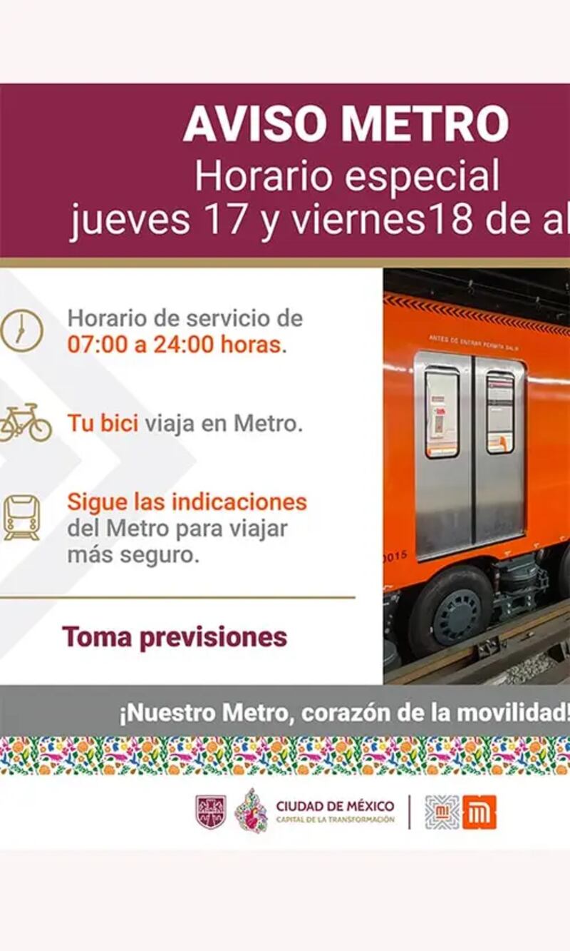 - Jueves 17 y Viernes 18 de abril (Jueves y Viernes Santo): Operará con horario de día festivo, de 7:00 a 24:00 horas en toda la red. Se aplicará el programa “Tu bici viaja en Metro”, permitiendo el acceso con bicicletas en los primeros y últimos vagones.