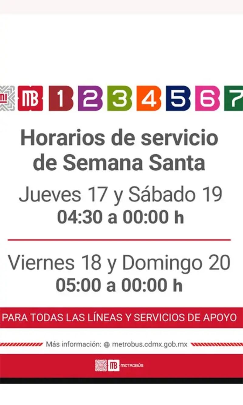 Durante la Semana Santa 2025, del 17 al 20 de abril, el Metro y Metrobús de la Ciudad de México operarán con horarios especiales, según información oficial de la Secretaría de Movilidad y los sistemas de transporte, que piden a los usuarios tomar las precauciones debidas para evitar contratiempos.